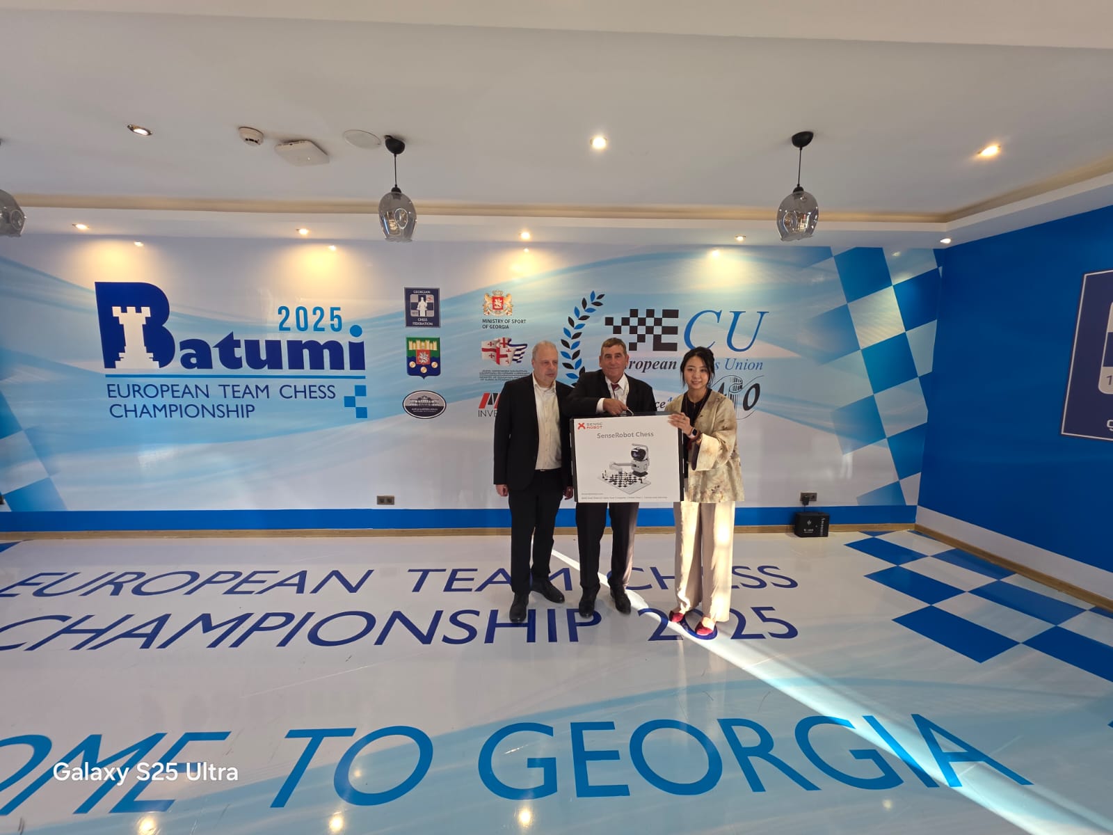 יו"ר האיגוד דר' צביקה ברקאי, מזכיר האיגוד האירופי לשחמט ונציגת חברה סינית המייצרת רובוטים משחקים שחמט.