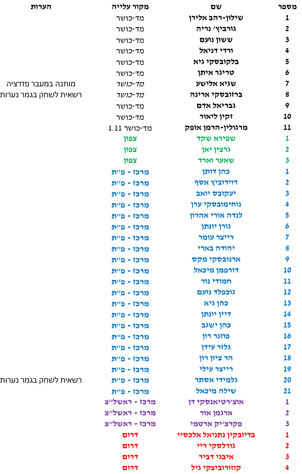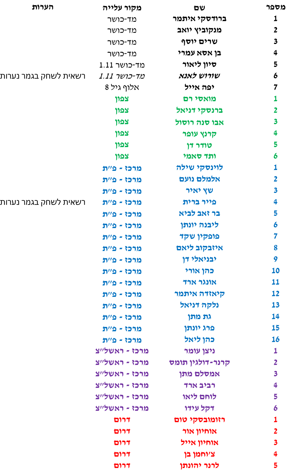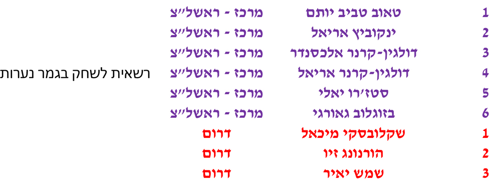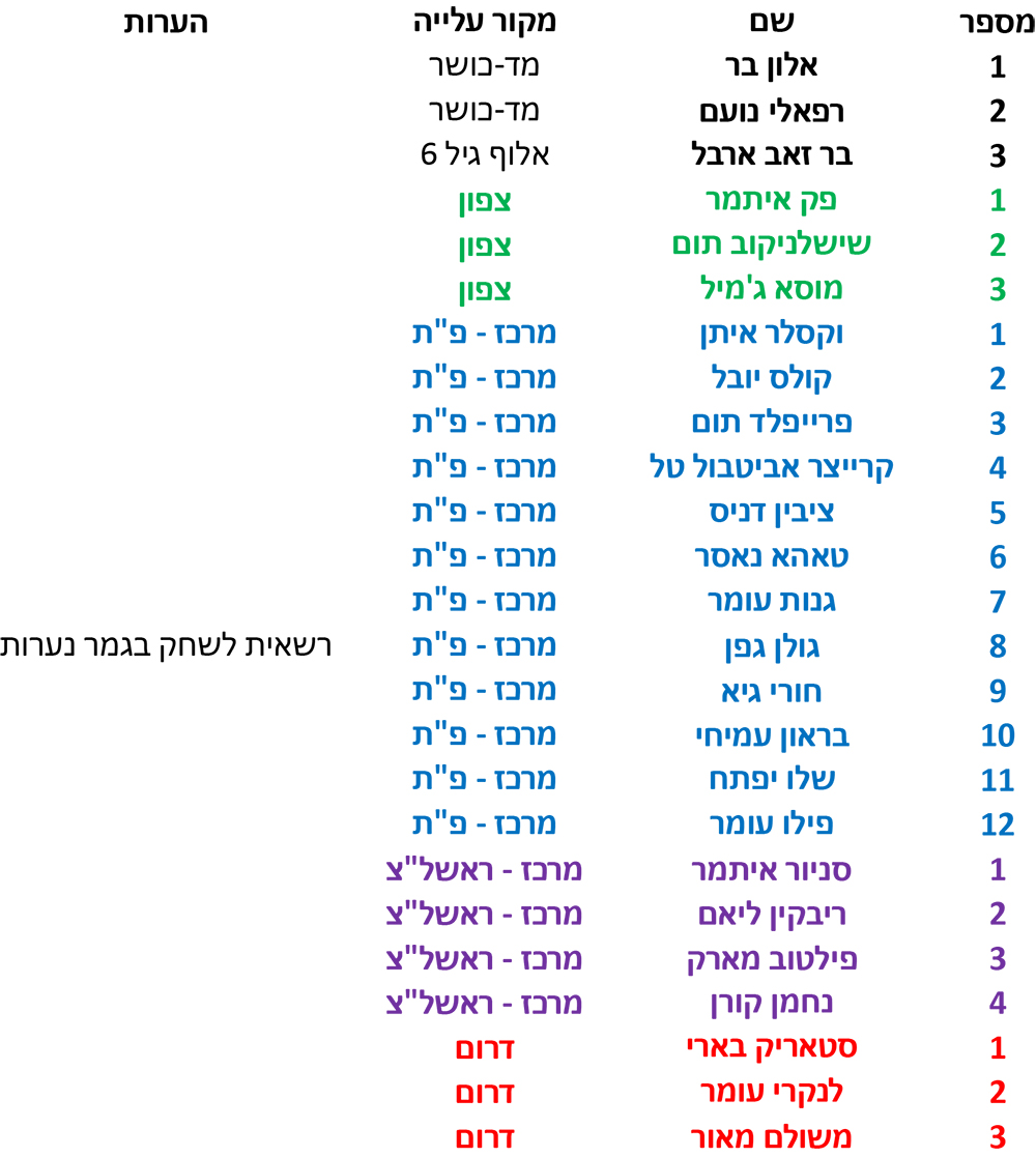 הבהרה בנוגע לעולים לגמר אליפות ישראל לנוער 20261. שחקנים אשר לא השתתפו בתחרות המוקדמות בקטגוריית הגיל שלהם לא נכללו בחישוב מד החוזק, אשר משמש כבסיס לקביעת מספר העולים מכל בית מוקדמות. במקומם עלו השחקנים הבאים בתור מאותו בית מוקדמות.