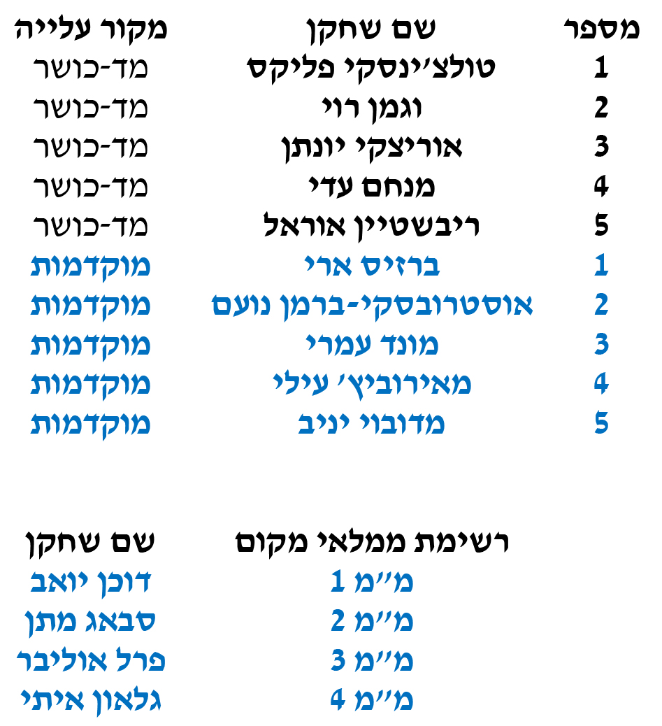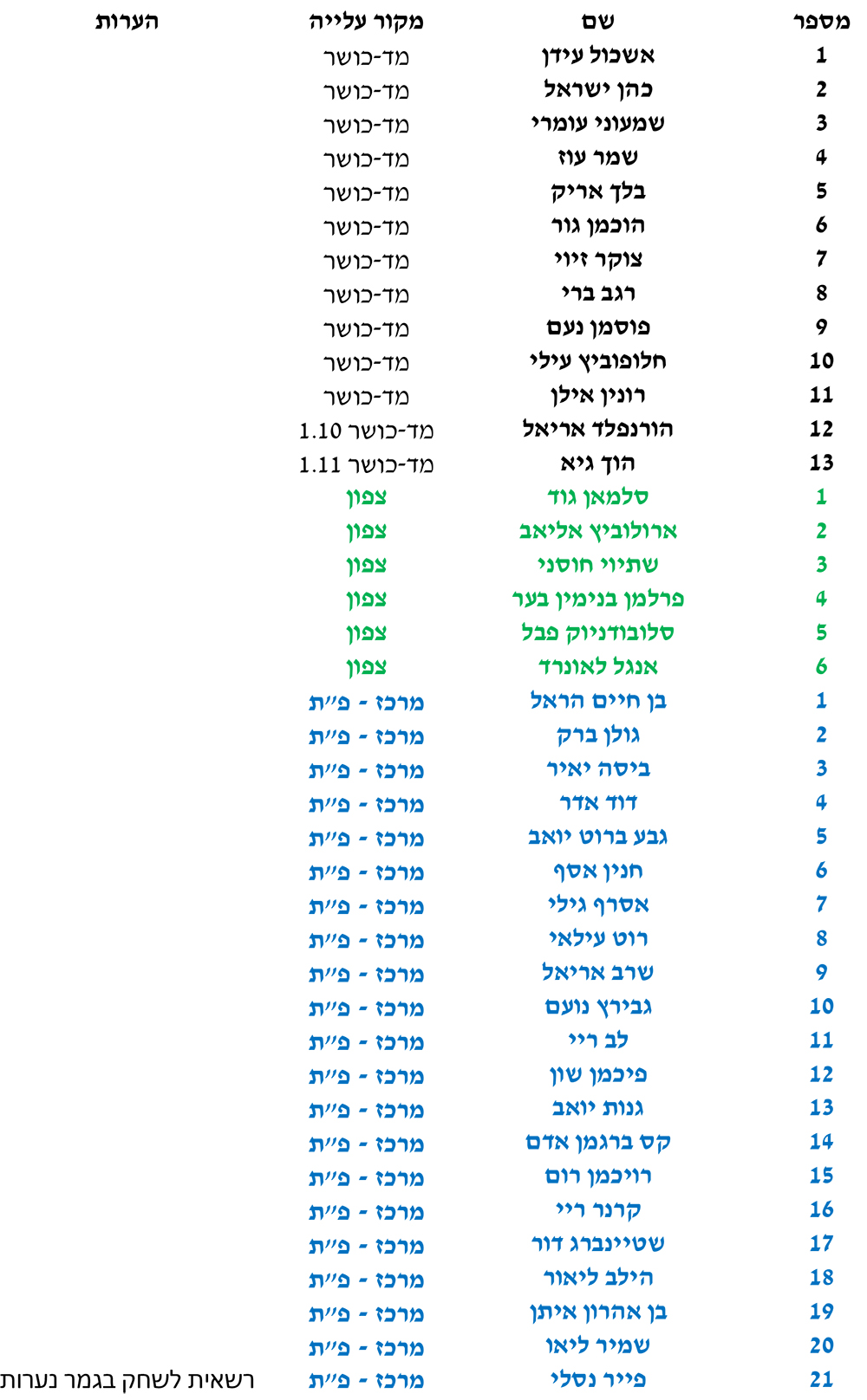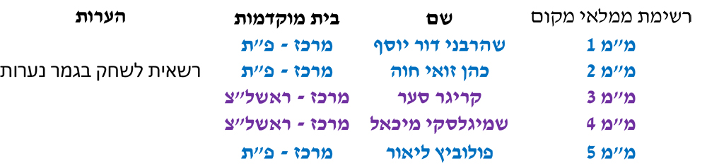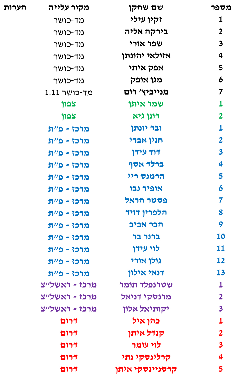 הבהרה בנוגע לעולים לגמר אליפות ישראל לנוער 20261. שחקנים אשר לא השתתפו בתחרות המוקדמות בקטגוריית הגיל שלהם לא נכללו בחישוב מד החוזק, אשר משמש כבסיס לקביעת מספר העולים מכל בית מוקדמות. במקומם עלו השחקנים הבאים בתור מאותו בית מוקדמות.
