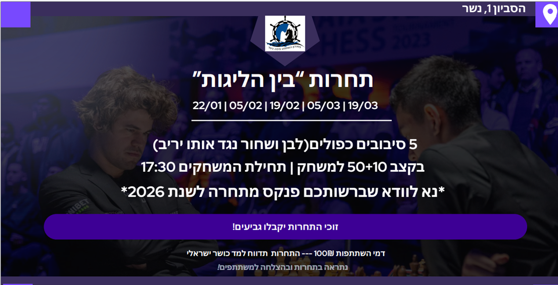 מועדון שחמט חיפה-נשר שמח להזמין אתכם לתחרות "בין הליגות", שתתקיים בימי חמישי בהם לא יתקיימו משחקי ליגה. התחרות תשוחק ב-5 סיבובים כפולים (לבן ושחור נגד אותו היריב).