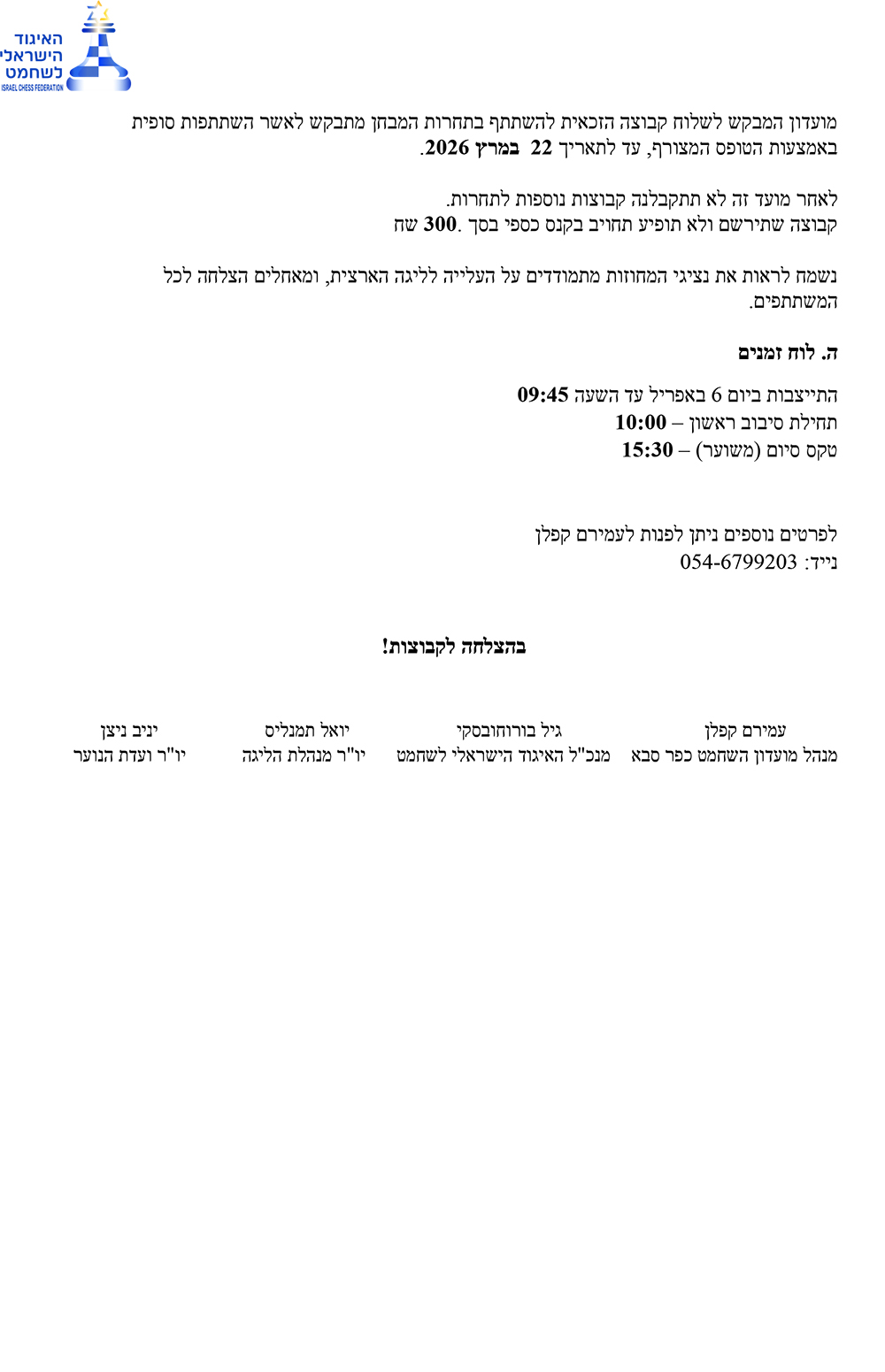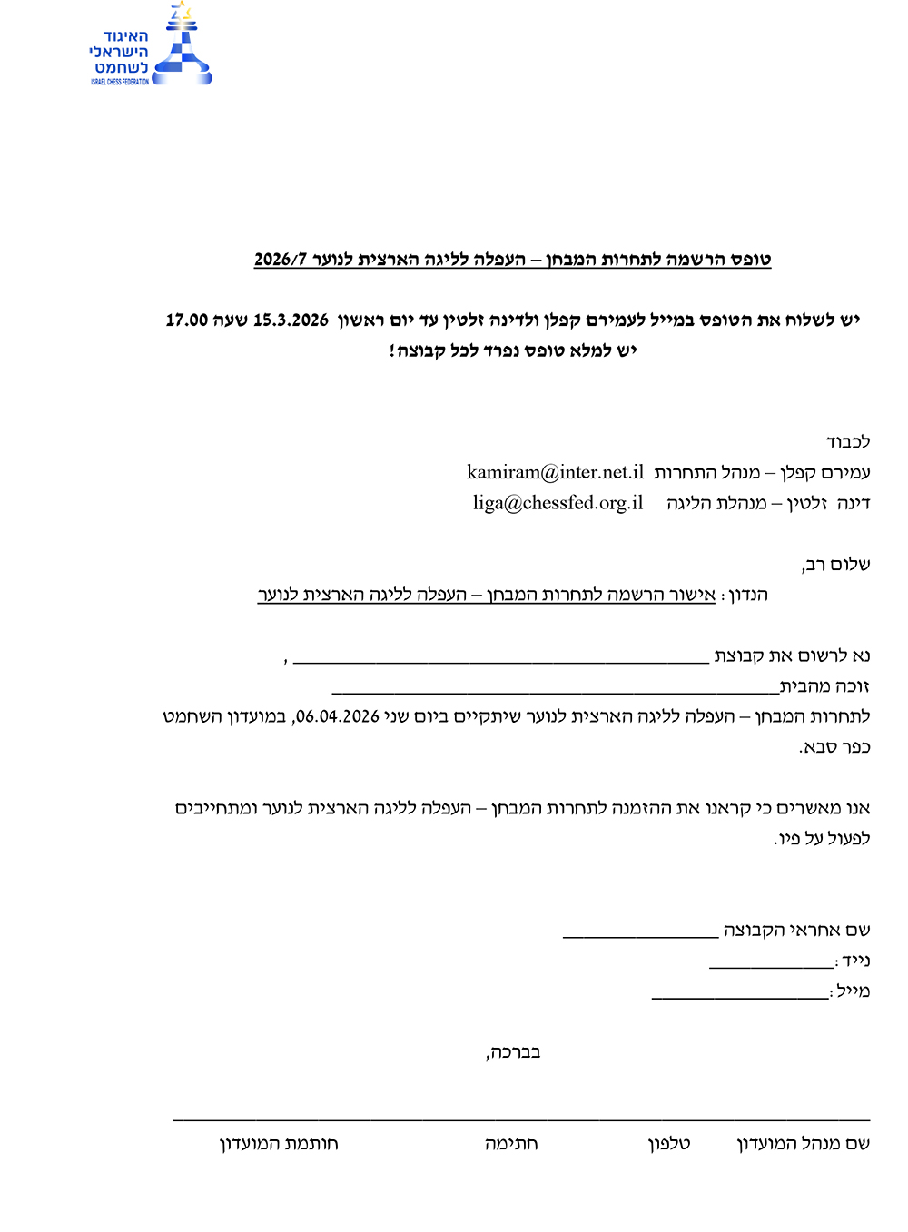 הזמנה לתחרות המבחן – העפלה לליגה הארצית לנוער 2026/7