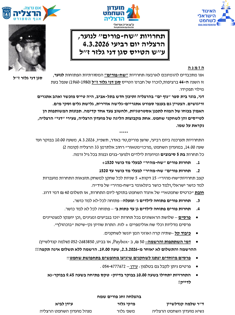 הזמנה לתחרויות "שח-פורים" לנוער, הרצליה