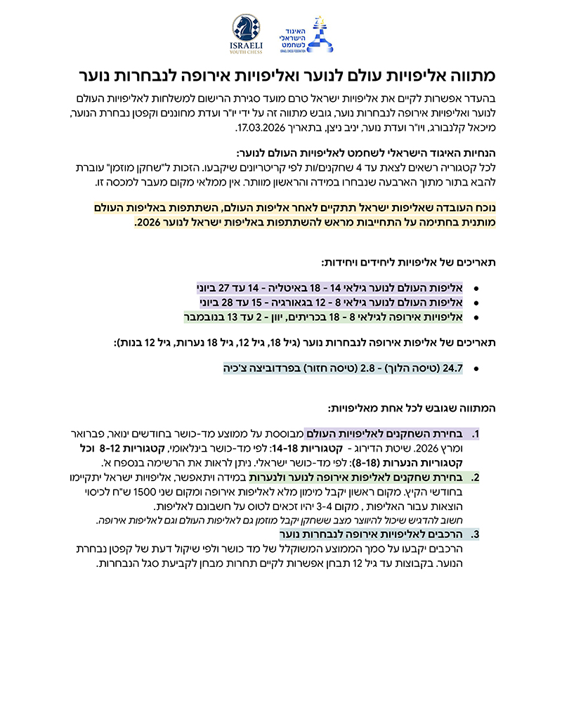3. אליפות אירופה לנוער ולנערות הזכאות לייצוג ומימון באליפות אירופה (שתתקיים בנובמבר 2026) תיקבע על סמך התוצאות באליפות ישראל לנוער שתתקיים בחודשי הקיץ. למידע מורחב ומפורט בנושא זה, ניתן לעיין במסמך המתווה המלא.