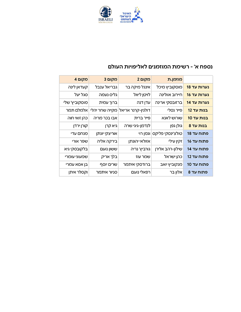 2.מתווה אליפויות עולם ואירופה לנוער ונבחרות נוער: המתווה גובש על ידי יו"ר ועדת הנוער, יניב ניצן, יחד עם קפטן נבחרת הנוער ויו"ר ועדת מחוננים, מיכאל קלנבורג, בהתאם לכללי המסגרת של האיגוד. מצ"ב המתווה. במהלך השבוע הקרוב, הזכאים יקבלו אימייל רשמי מהאיגוד עם פירוט העלויות. לשאלות בנושא המשלחות ניתן לפנות למיכאל קלנבורג.